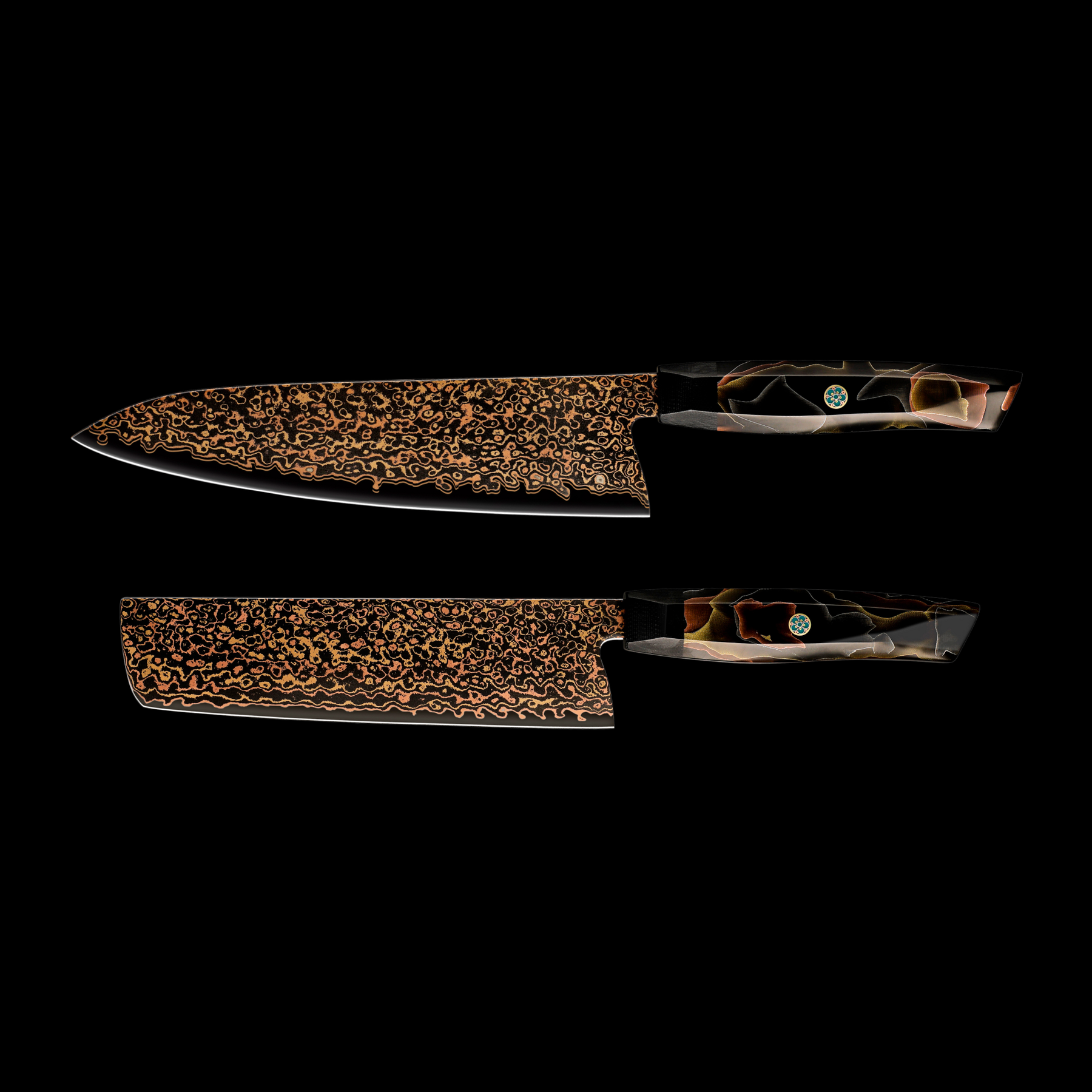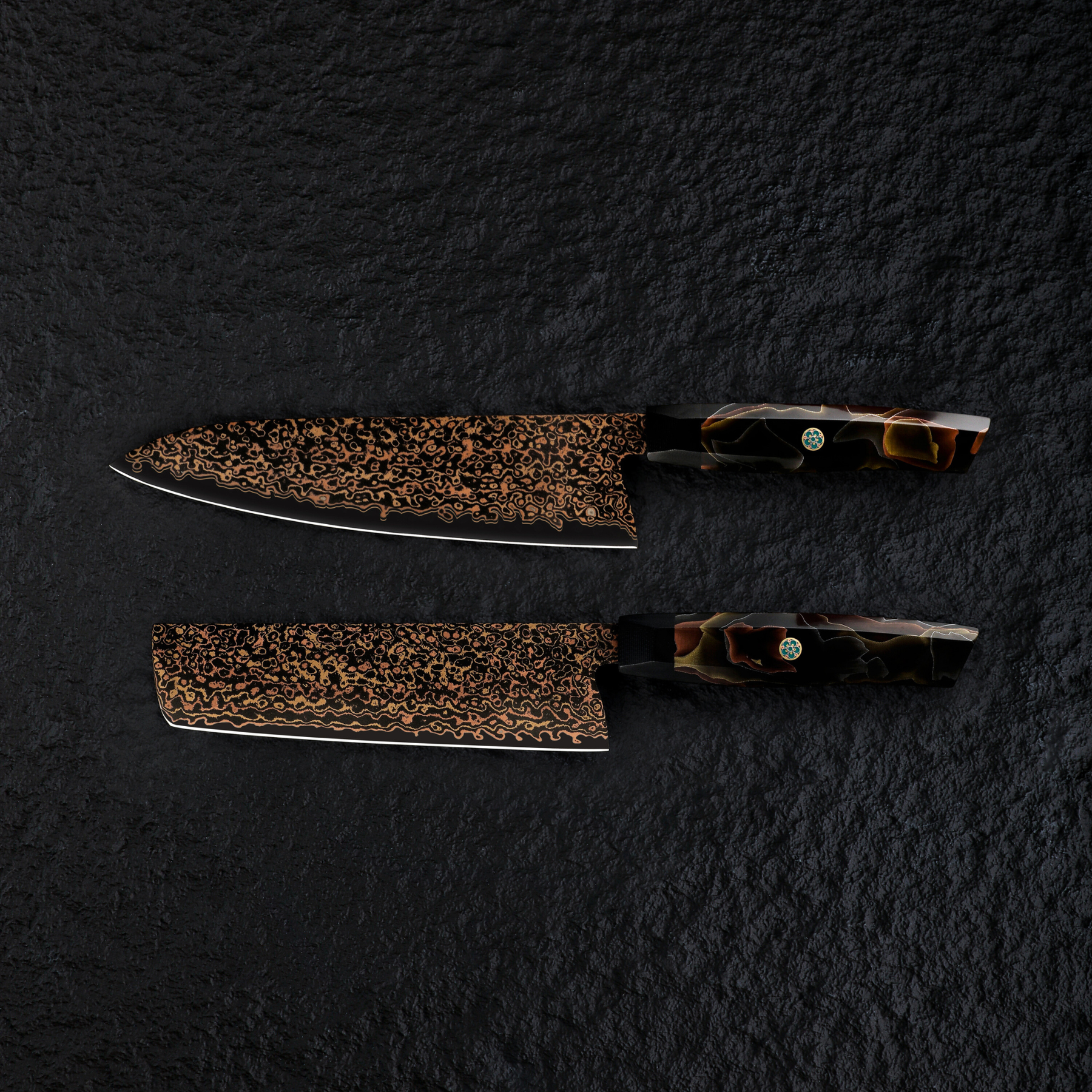 The Yōgan 2-Piece Performance Set pairs two powerhouse blades built for strength and precision. Each knife is forged by master blacksmiths in Seki, Japan, from 36 layers of black Copper Damascus steel with a VG-10 core.