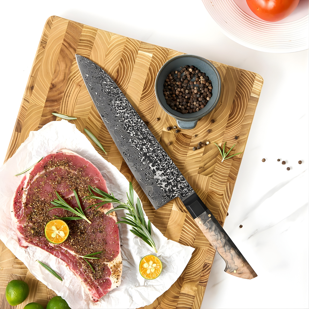 Similar to other knives, the steel of a chef's knife can be folded either singly or multiple times. When multiple layers of steel are used for the blade, it's referred to as Damascus steel. Damascus chef's knives are generally more expensive than monosteel chef's knives due to their more complex manufacturing process. However, the investment is worthwhile; the unique grain of the blades appeals to both hobbyists and professional chefs alike. To ensure every customer receives a personalized knife, we exclusively offer chef's knives made of damascus. Of course, monosteel blade options are also available. As long as high-quality steel is used, these knives should not be inferior to those made of Damascus steel.