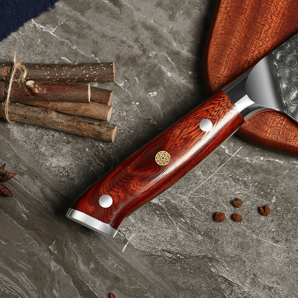 The full-tang, triple-riveted Rosewood handle benefits from a traditional Japanese stabilization process, significantly enhancing its resilience to extreme temperatures and dampness.