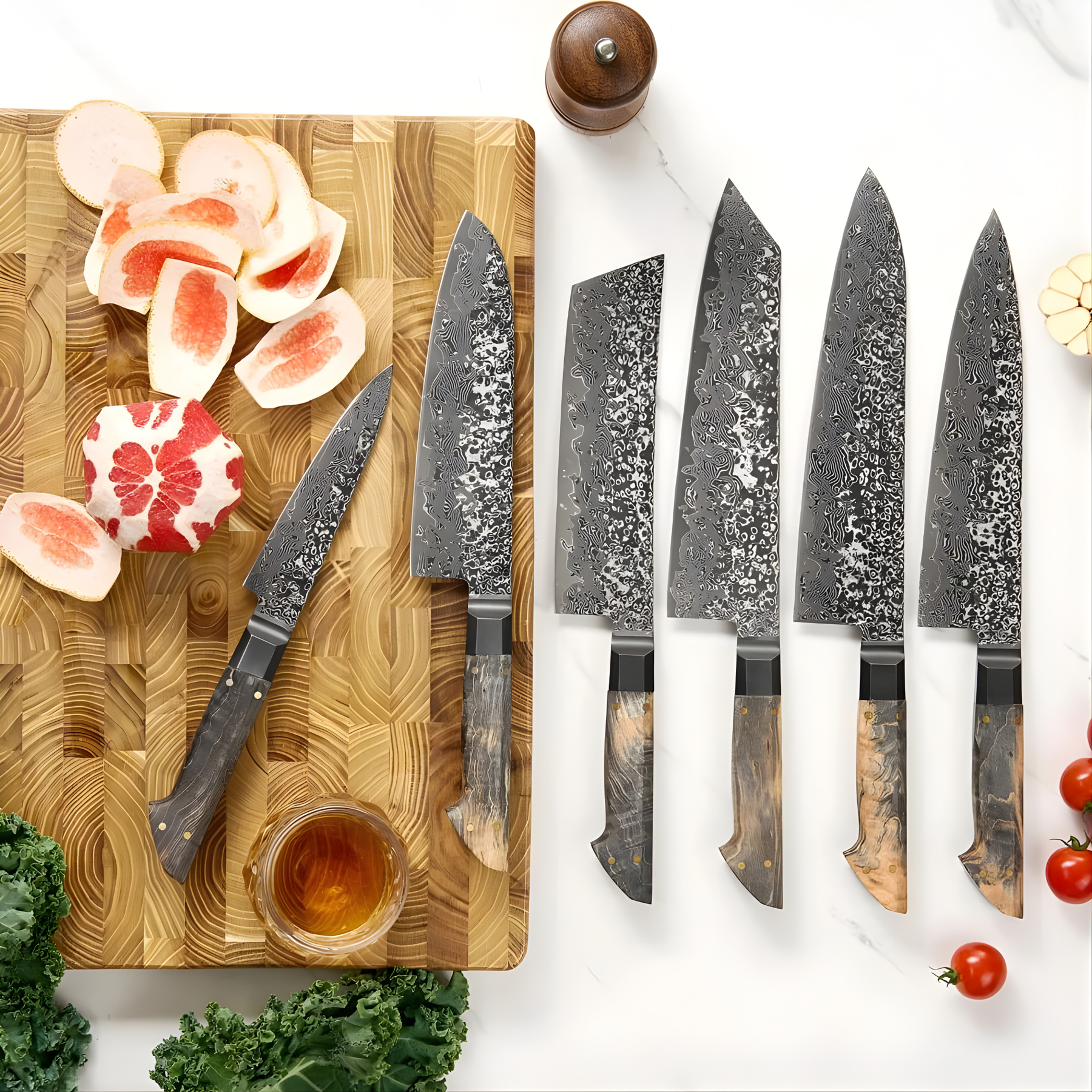 Hand-forged from 67 layers of Damascus steel, these blade offer superior sharpness and durability with unique ripple patterns.