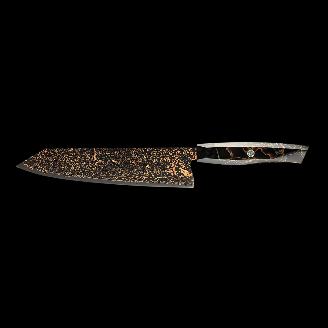 The Yōgan Series is where bold craftsmanship meets modern performance. Forged from 36 layers of black Copper Damascus steel, each blade carries a dark, fluid energy that commands attention. Its power is echoed in the handle, premium G10 fused with copper mesh and resin, accented by mosaic rivets that secure the full tang construction.